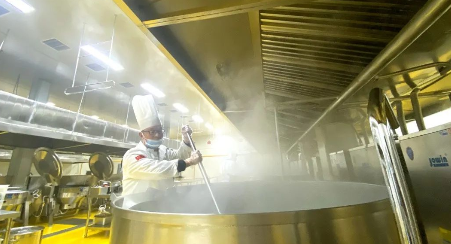 “菜品炒制過程中我們都是按照公司研發部制定的標準化菜單加工制作菜肴,實行專人專菜,保證菜品口味統一。這么大的廚房只需要不到20人就能完成所有配餐工作。”走進主食加工區,李修見自豪的說:“米飯生產線使用的是T600遼寧軍艦專用米飯生產線,鏈條循環式加工,20分鐘生產可供7千至8千人食用,一條米飯生產線只需要一人操作,規避安全生產隱患,在信陽我們可是頭一家。”